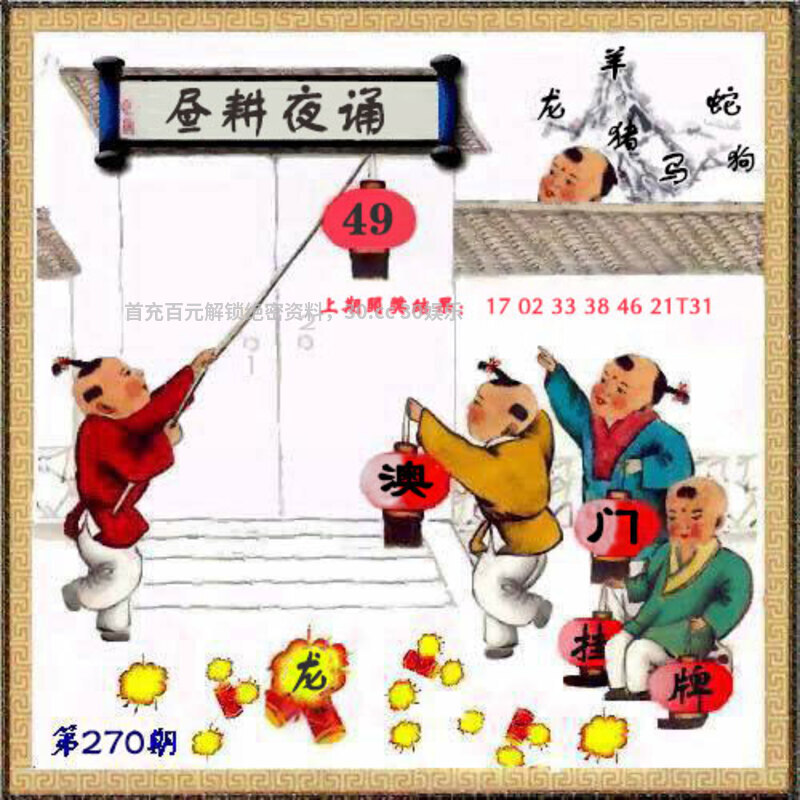 260期:【解抓码图】【开兔03】 破解图文:图中有一位老先生,手里有一朵花,一桶钱。 综合九肖:猪羊兔鸡虎马狗鼠蛇 综合七肖:猪羊兔鸡虎马狗 综合五肖:猪羊兔鸡虎 综合三肖:猪羊兔 综合十码:07.19.35.03.33.04.24.32.06.13 |