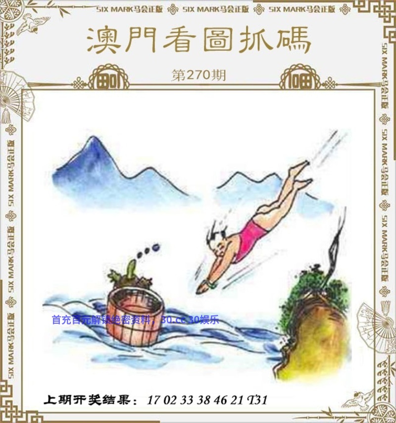 270期:【解抓码图】【开羊35】 破解图文:图中有一个人正从高处跳入水中,旁边有一个木桶和一只乌龟。 综合九肖:蛇鼠龙狗马兔虎羊鸡 |